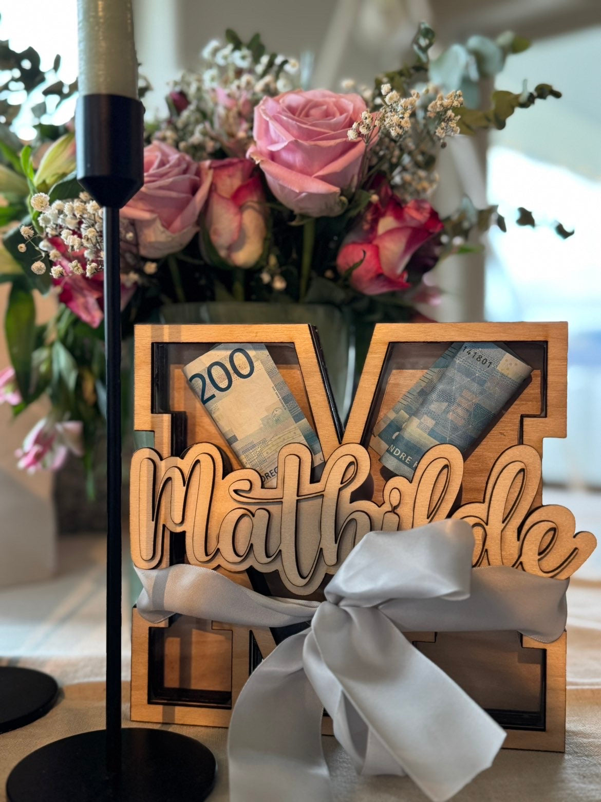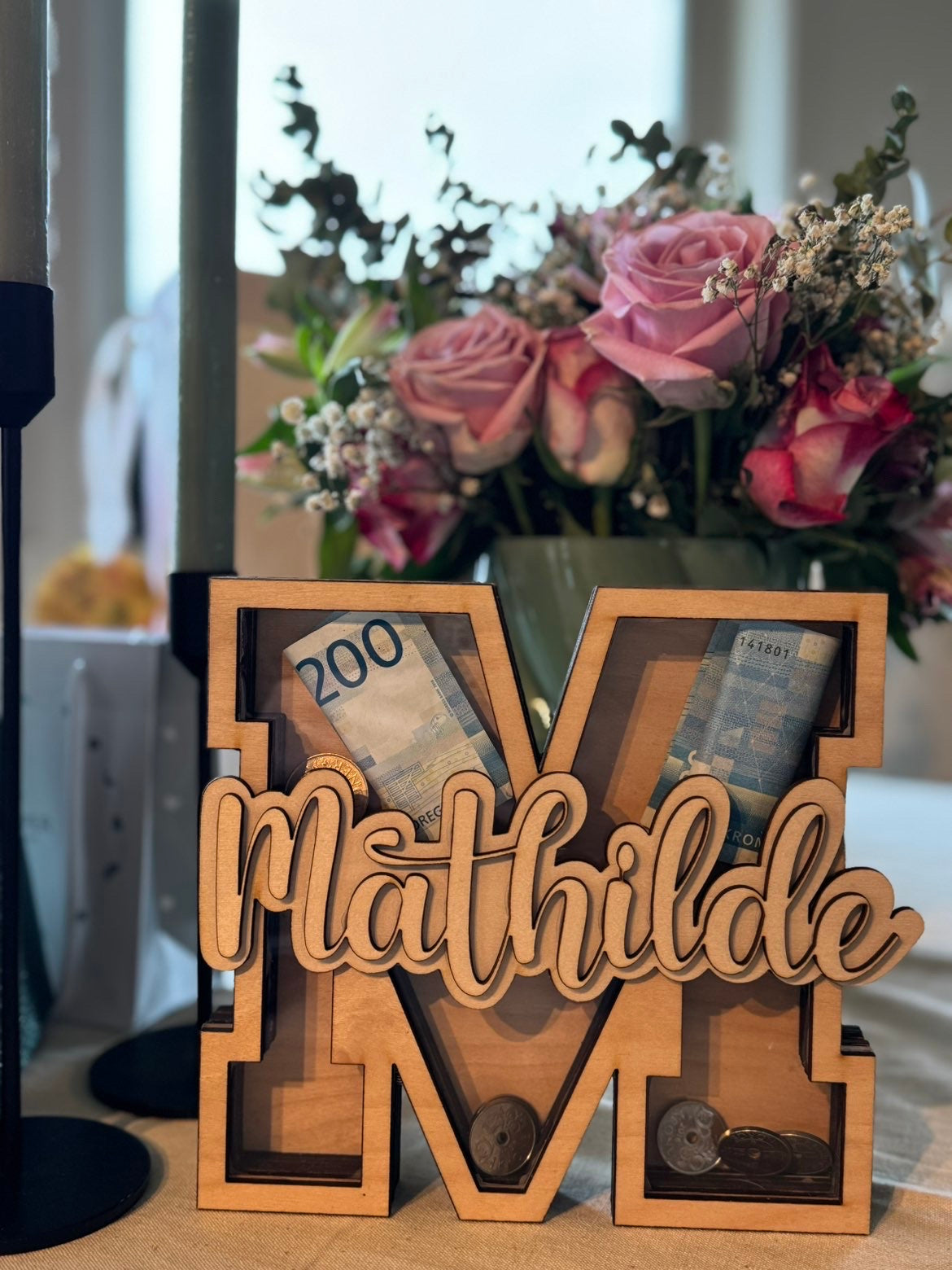 Personlig sparebørse i tre formet som bokstav, med valgfritt navn på fronten. Perfekt som pengegave til konfirmasjon, bursdag, dåp eller andre anledninger.
