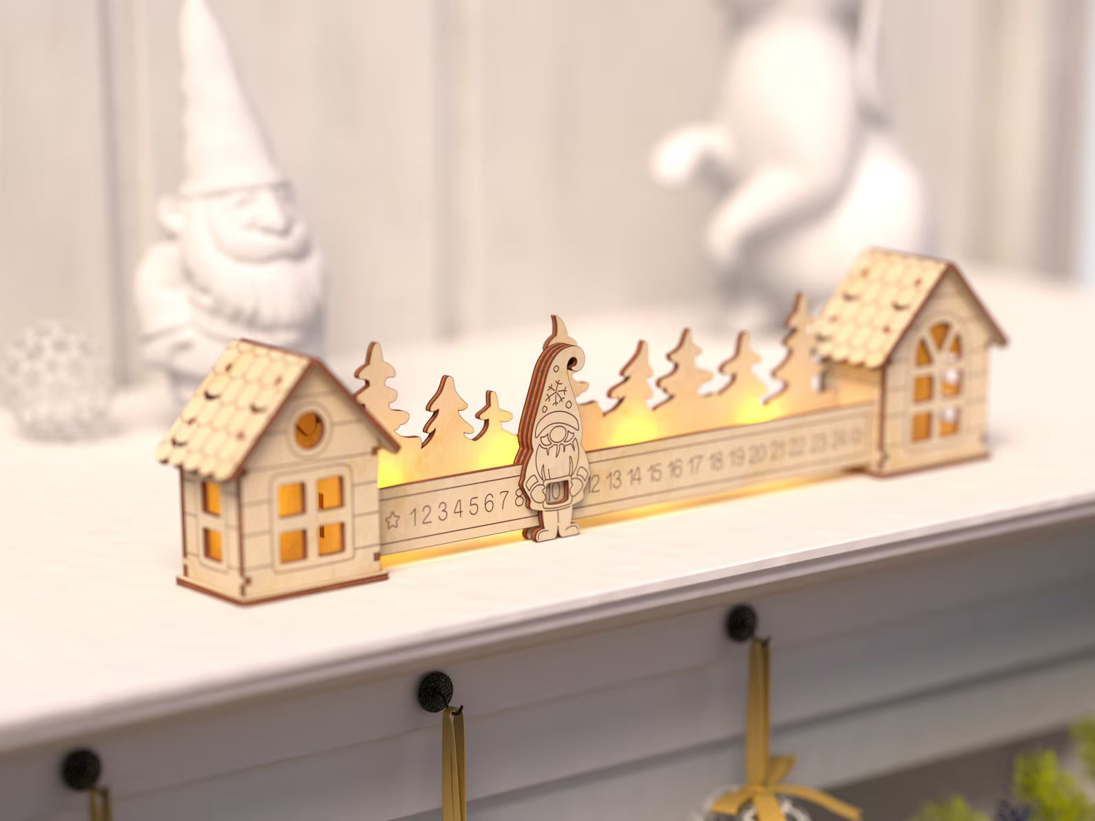 Gjør ventetiden frem til jul ekstra koselig med denne sjarmerende nedtellingsdekorasjonen i tre. Mellom to små julehus kan du flytte nissen dag for dag, helt frem til julaften.