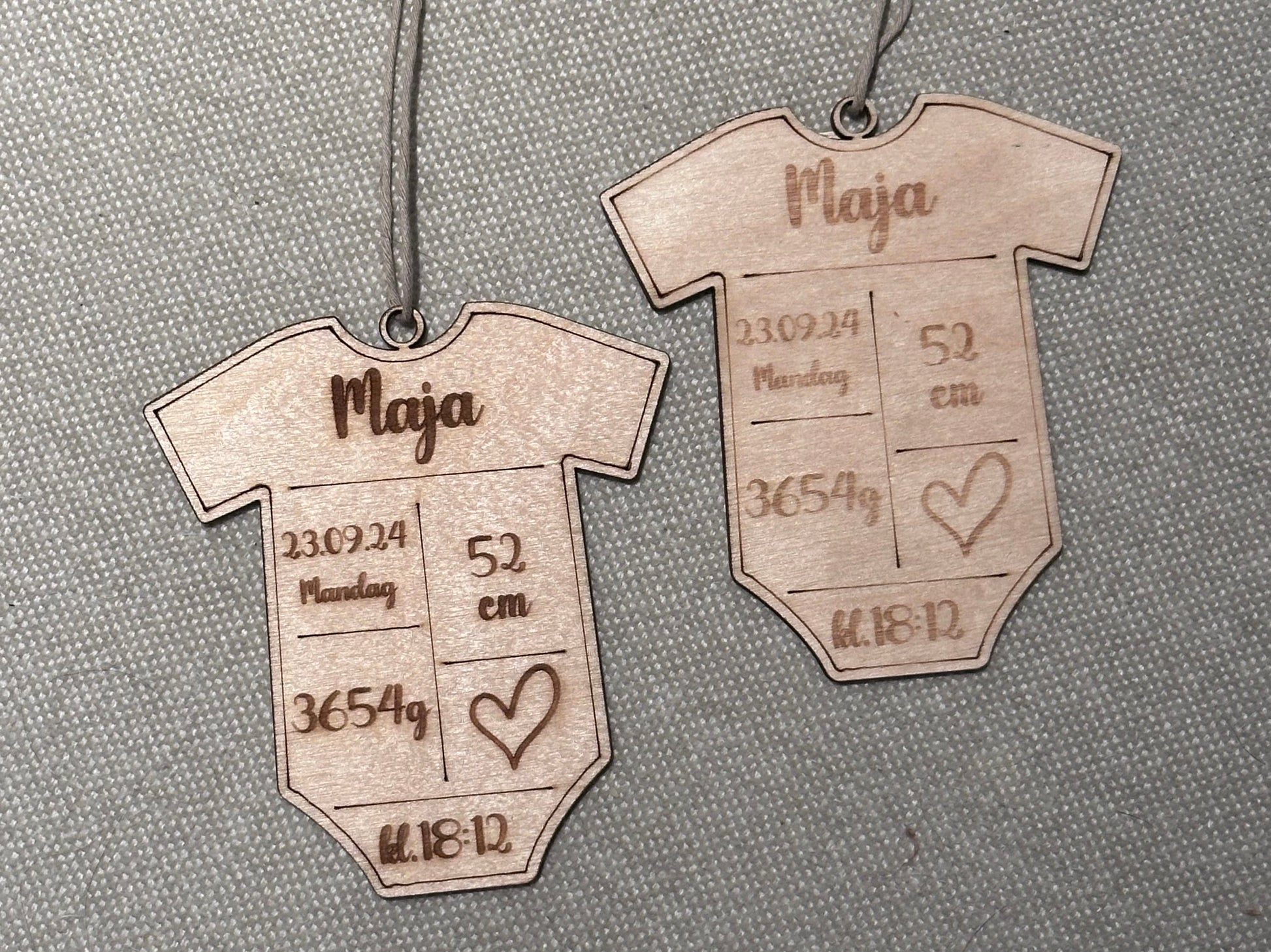 Personlig julepynt i tre, gravert med navn og fødselsdetaljer 🤍